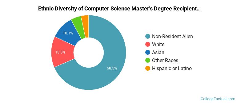 During the 2021-2022 academic year, 75 compsci majors earned their master's degree from Cal State Fullerton. Of these graduates, 76% were men and 24% were women.