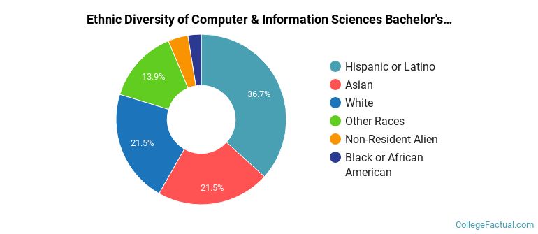 The following table and chart show the ethnic background for students who recently graduated from California State University - Stanislaus with a bachelor's in computer & information sciences.