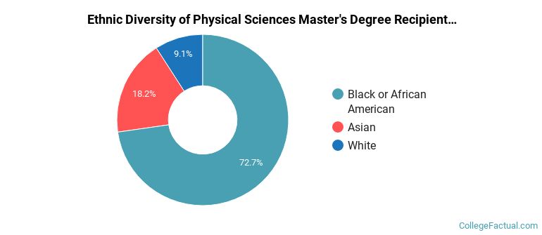 Of the 11 students who earned a master's degree in Physical Sciences from North Carolina Central University in 2021-2022, 45% were men and 55% were women.