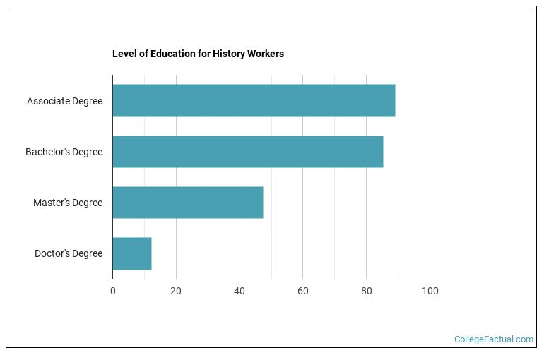 About 85.4% of workers in careers related to history obtain at least bachelor's degrees. See the chart below for the most common degree level workers in history have received.
